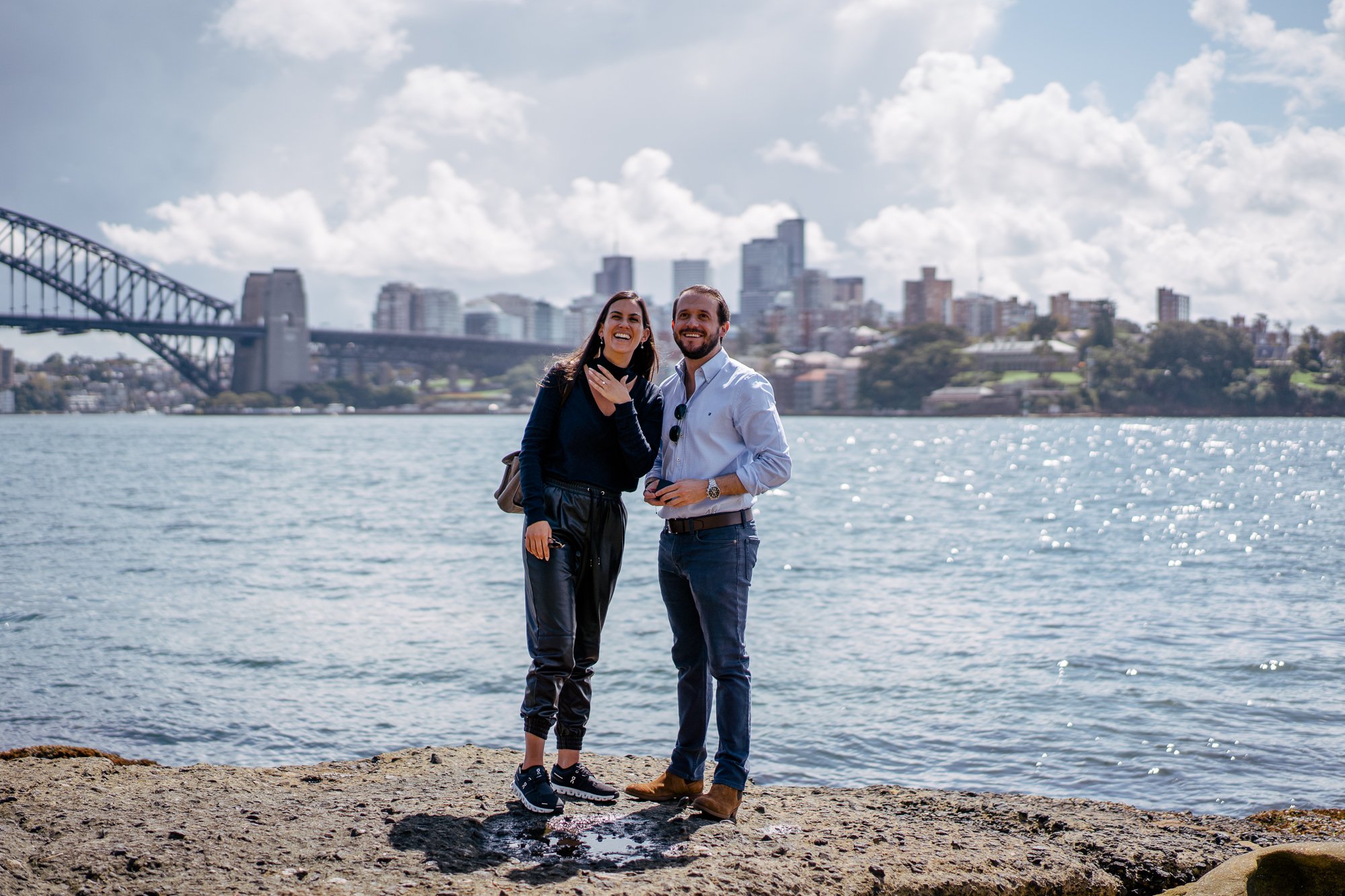 Alfredo planning his surprise Sydney proposal like a king. He reached out from Mexico to me and had tons of ideas but he landed on the iconic Mrs Macquarie’s Chair for his surprise proposal. The whatsapp chat was on fire in the hours leading up to him dropping the knee, I was so impressed how well we planned everything. He led his partner and family around a long walk on a beautiful Sydney day and stopped at the iconic spot for a picture, I was setup pretending to take landscape photos and then quickly pivoted to him dropping the knee. Their close family knee what was happening and cheered from the sides of the rock platform, embracing after for a huge congratulations. We had tons of fun taking some beautiful portraits together around the harbour and sydney’s botanical gardens.